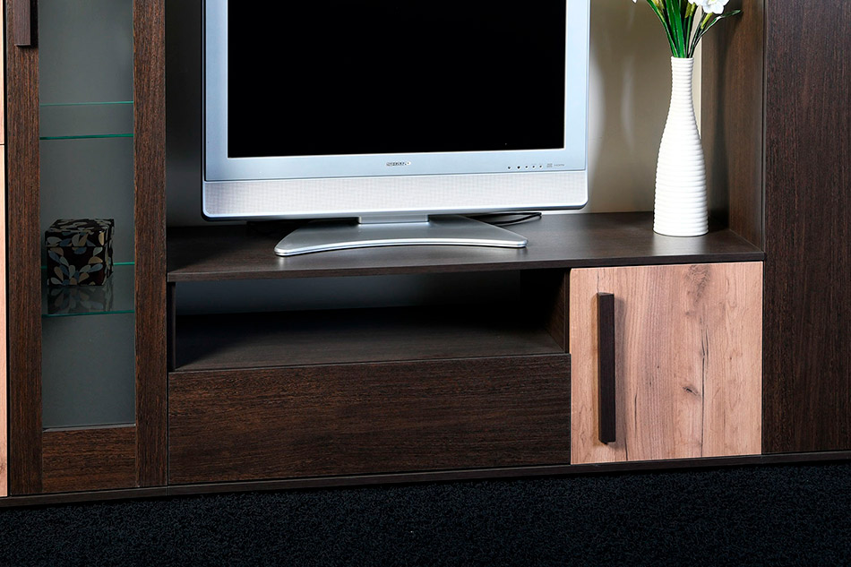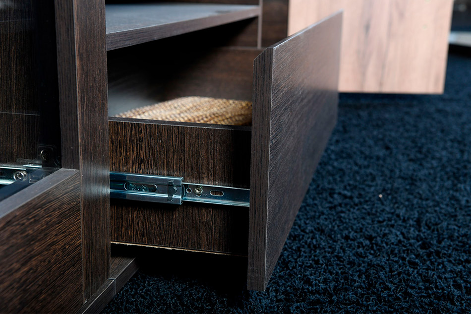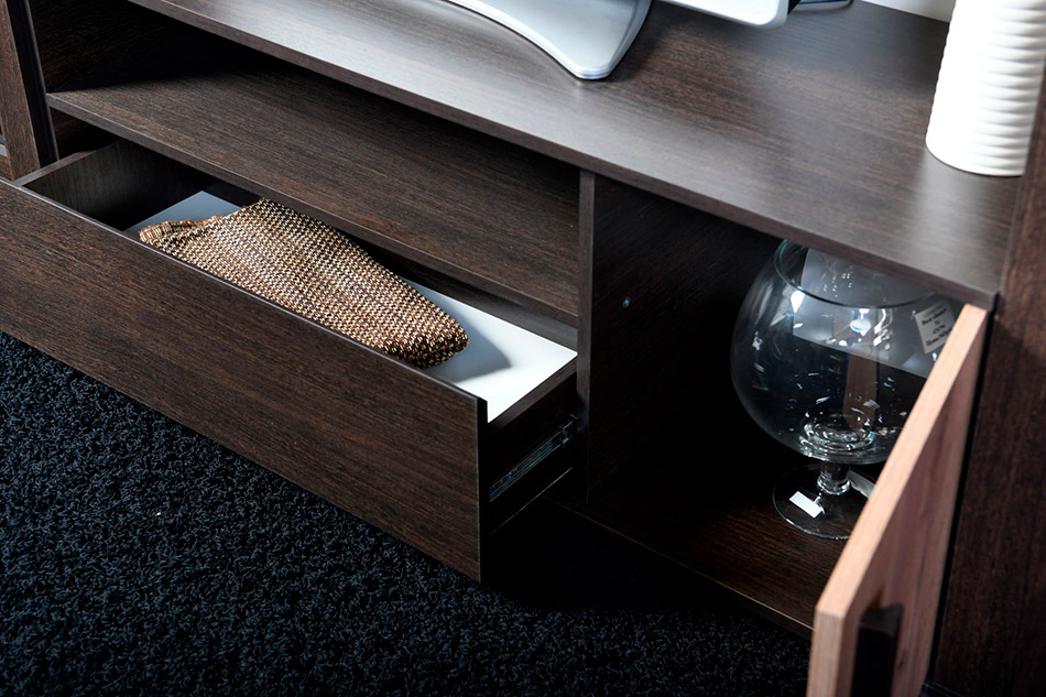 Открытая ниша пригодится для необходимой аппаратуры, а вместительный выдвижной ящик и отделение с дверцей созданы для аккуратного хранения всех важных предметов. Фурнитура закрывания фасадов с доводчиками.
