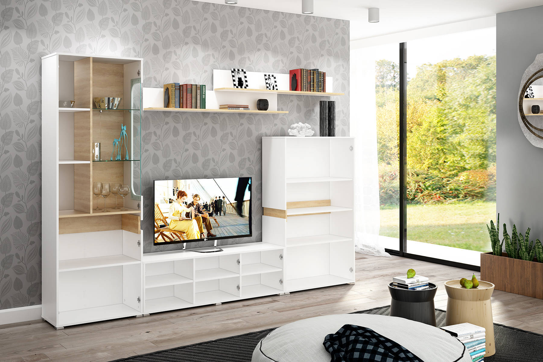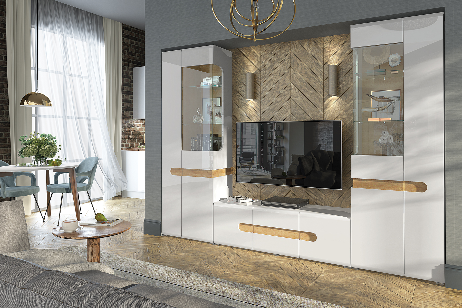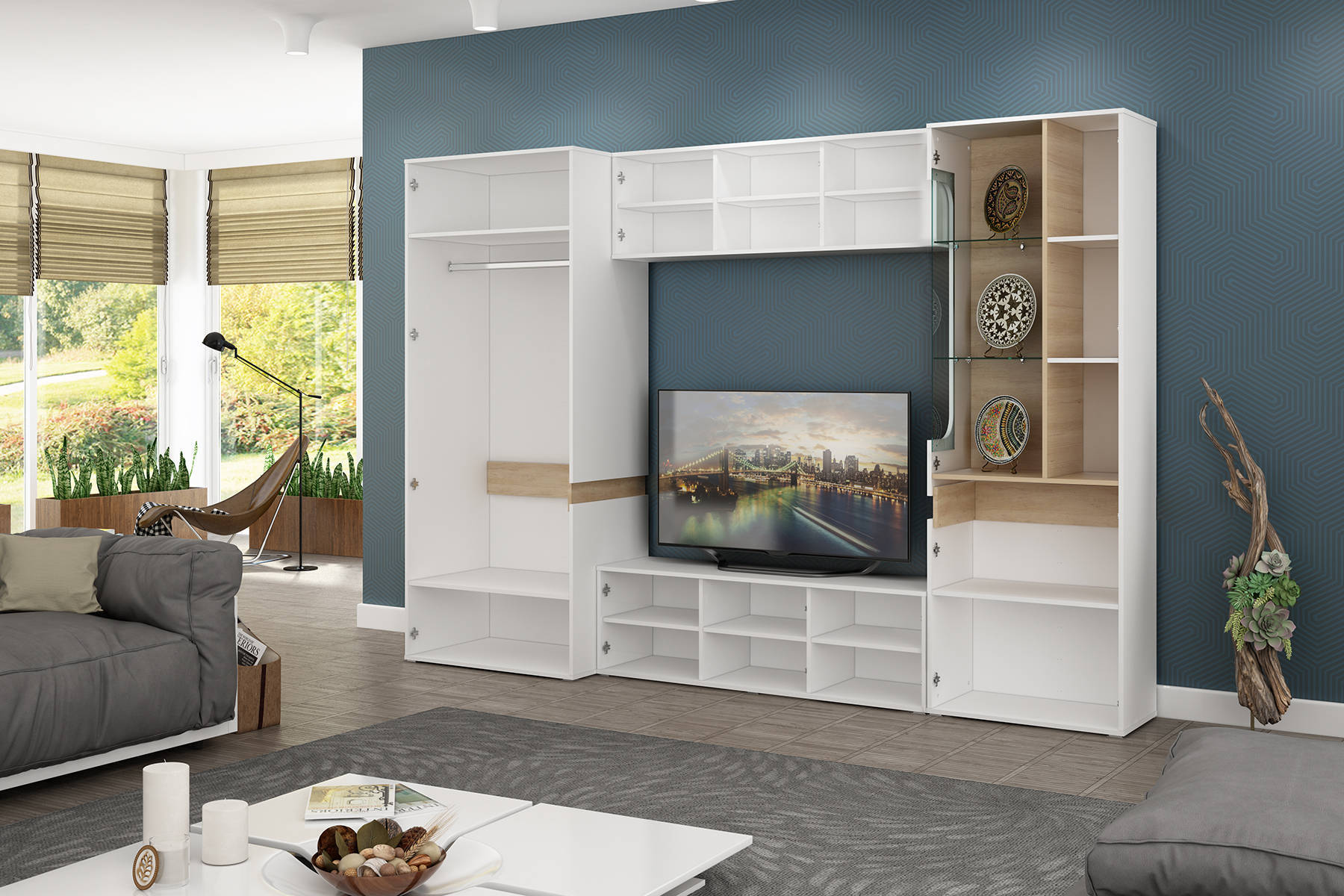 Корпус модульной системы изготовлен из ЛДСП 16 мм цвет «Белый». Фасады изготовлены из МДФ цвет «Белый» и ЛДСП 16 мм цвет «Дуб Небраска». На фасадах выполнена фрезеровка под ручки. Петли четырехшарнирные с доводчиком. Опоры пластиковые цвета хром глянец.