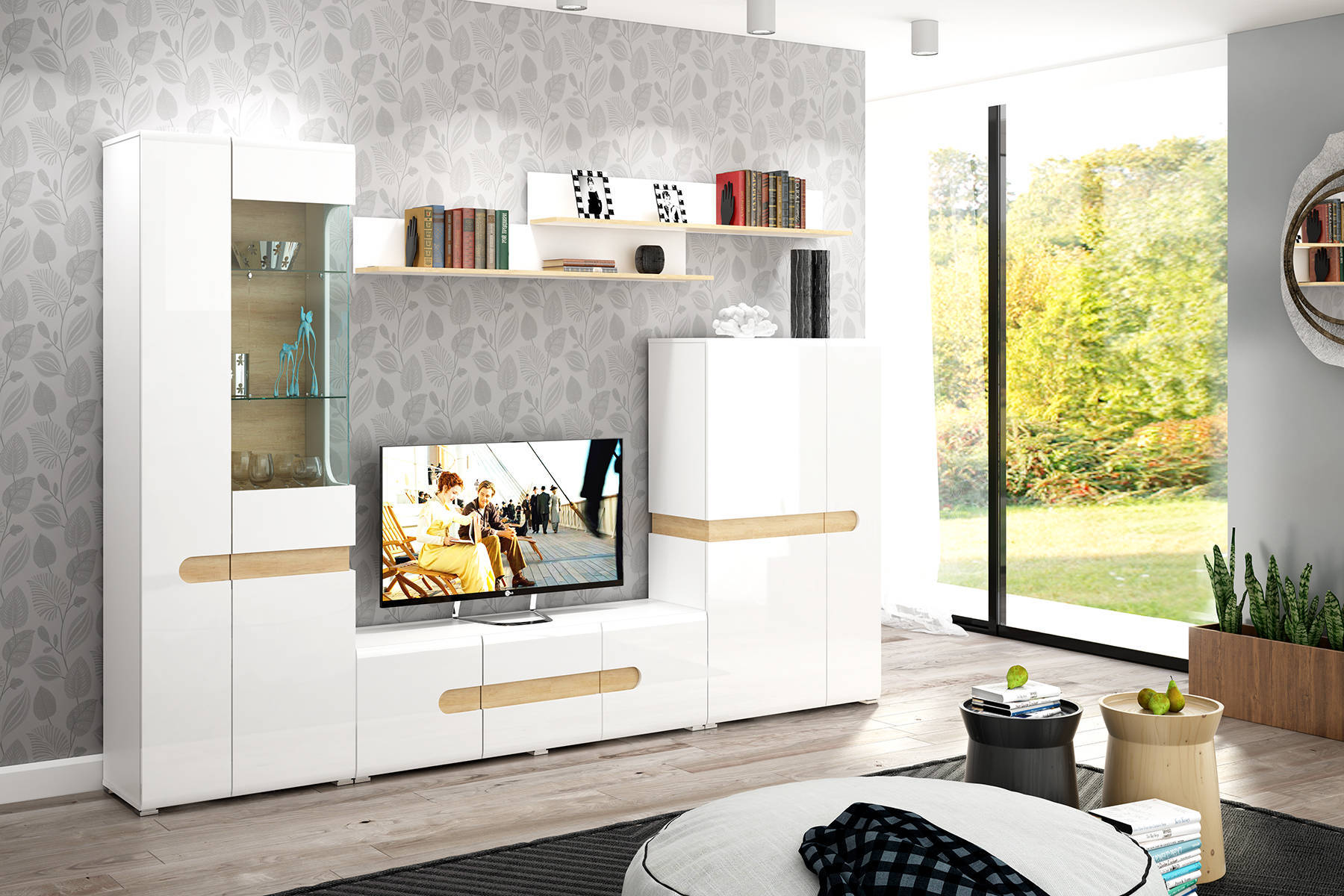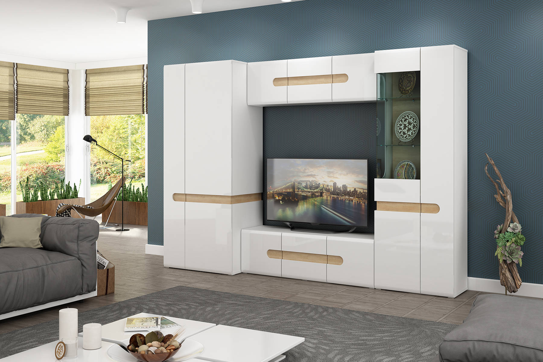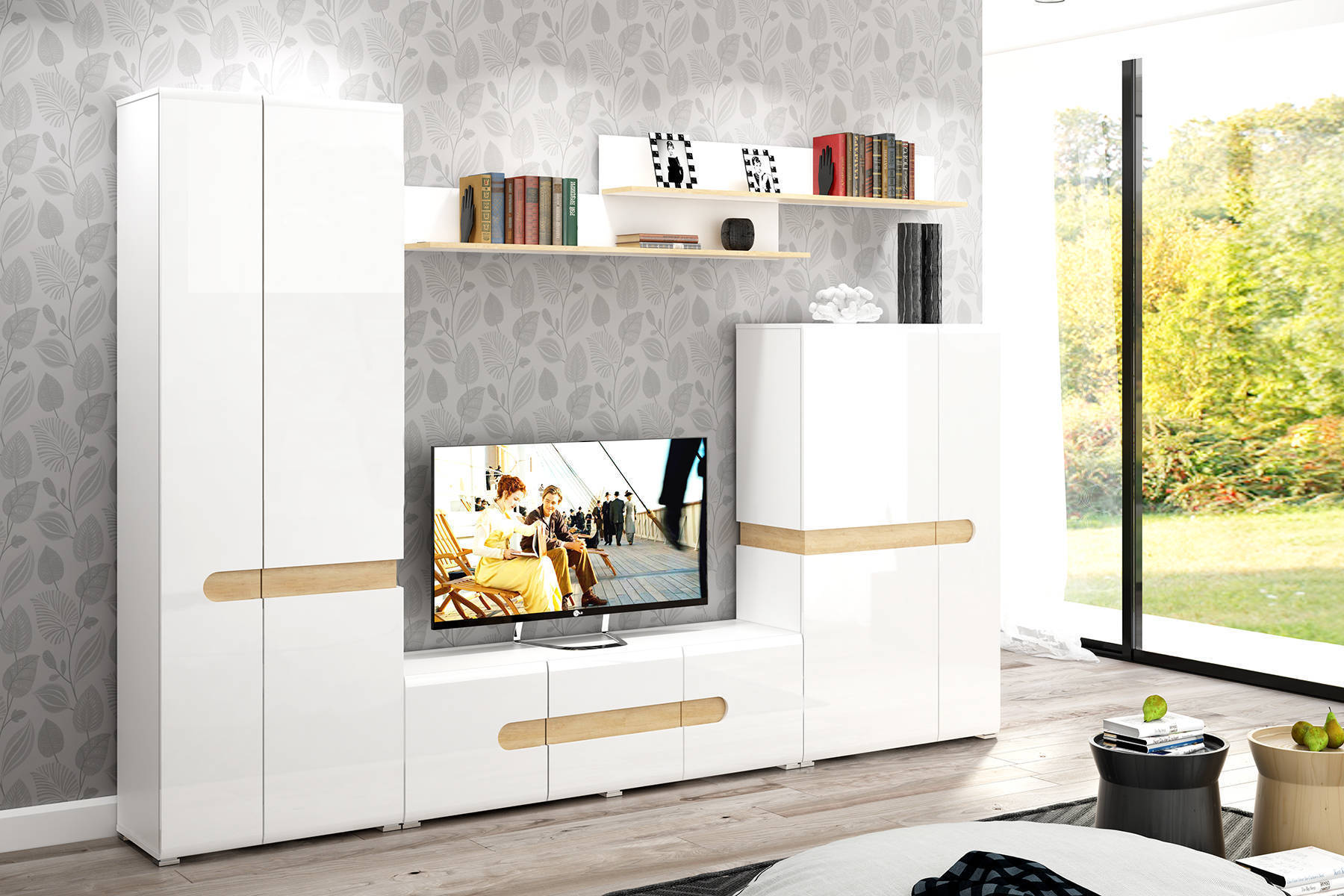 Корпус модульной системы изготовлен из ЛДСП 16 мм цвет «Белый». Фасады изготовлены из МДФ цвет «Белый» и ЛДСП 16 мм цвет «Дуб Небраска». На фасадах выполнена фрезеровка под ручки. Петли четырехшарнирные с доводчиком. Опоры пластиковые цвета хром глянец.