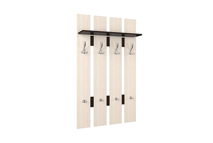 Вешалка в прихожую №1 - прекрасный вариант для необльших прихожих, а также как дополнение к уже установленным. Изготавливается из ЛДСП в трех вариантах цветов - Венге \ Дуб молочный, Ясень шимо светлый \ Ясень шимо темный и Дуб сонома. Крючки пластиковые.