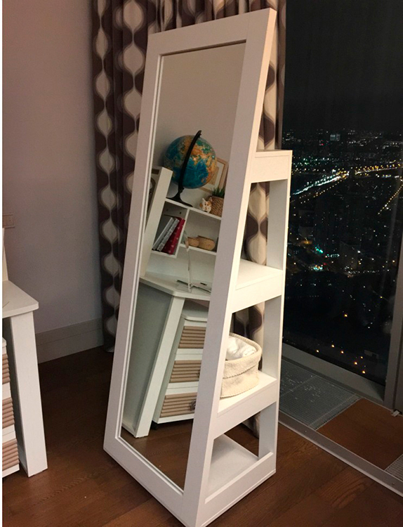 Зеркало напольное Саманта СМ-9 - оригинальное стационарное напольное зеркало в лаконичной широкой раме и с потайными, с тыльной стороны, полками для мелочей, одновременно служащими опорой.